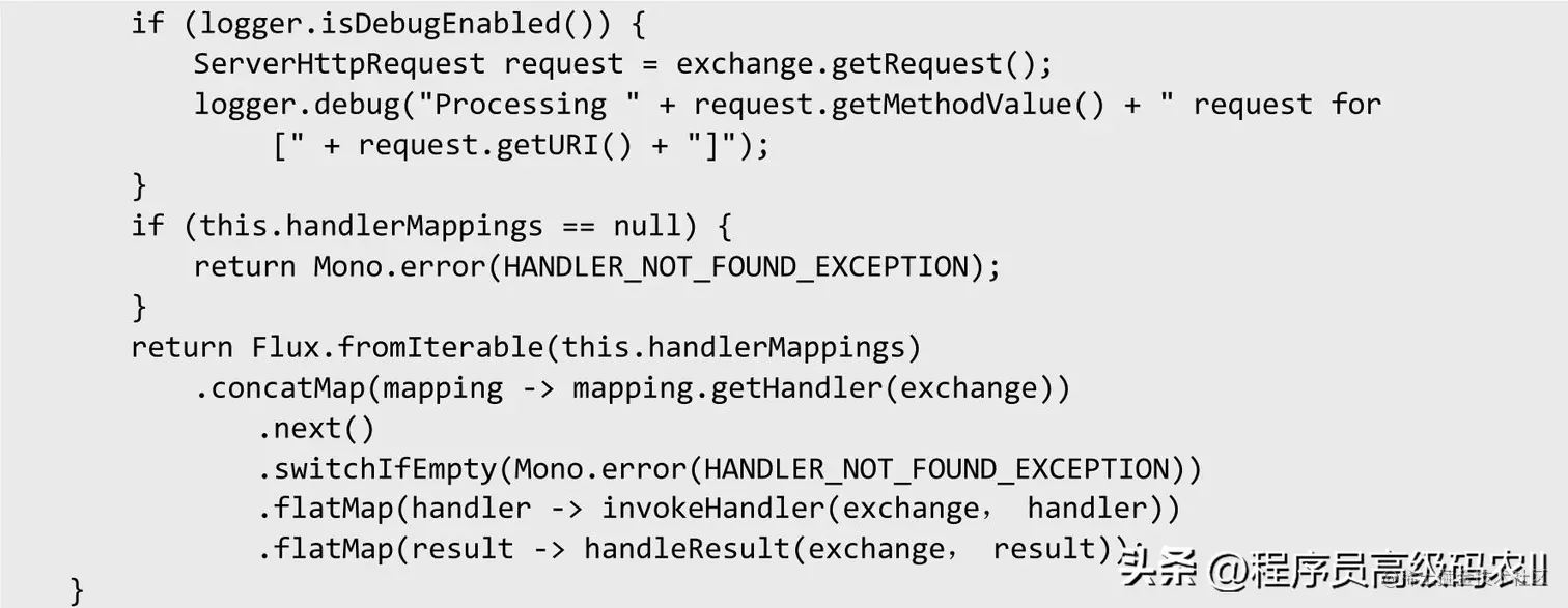 DispatcherHandler 调 用 handler 方 法 迭 代 handlerMappings 中 的HandlerMapping接口,主要源码如下: