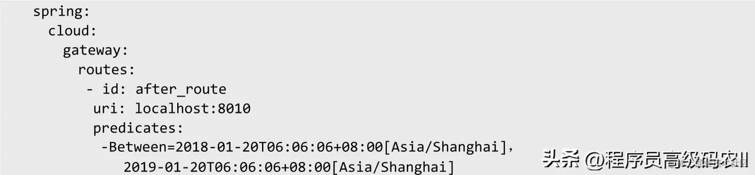 设置时间前断言:从Before Route Predicate Factory中获取一个UTC时间格式的参数,当请求的当前时间在配置的UTC时间之前,则成功匹配,否则不能成功匹配。下面是实例配置: