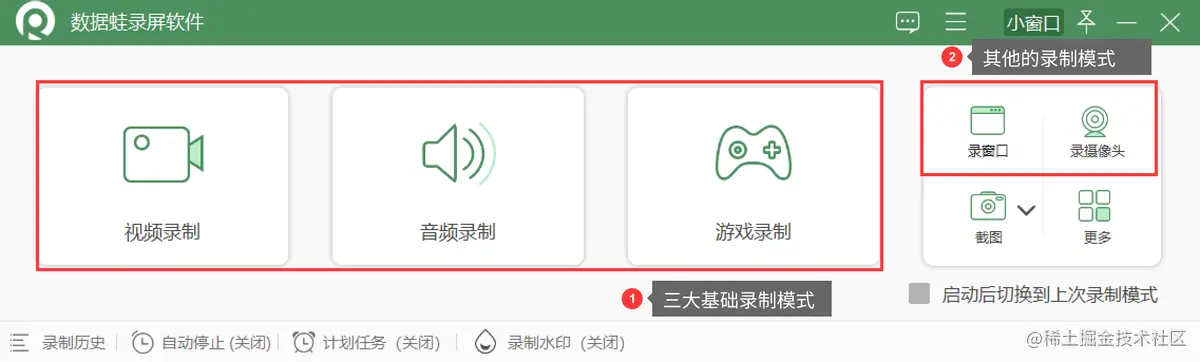 **步骤1:**首先在电脑端上安装好数据蛙录屏软件,双击打开后,点击需要进行的录制模式。