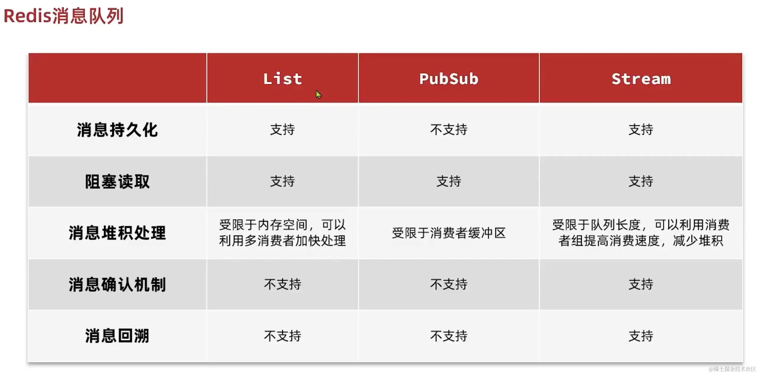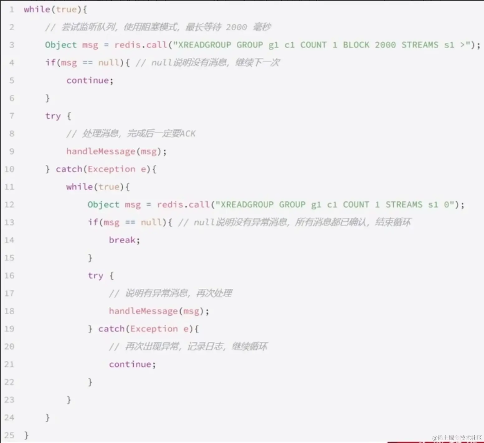 - 消息确认机制:默认消费的消息为pending 状态,会放到每个消费者的 pending list 中,只有消息由消费者确认(ACK),才会从 pending list 移除。这样如果消费业务处理异常,可以从 pending list 的开头依次读取未确认消息,重试处理。(也要避免无限重试,实在处理不成功就强制 ACK + 业务记日志)