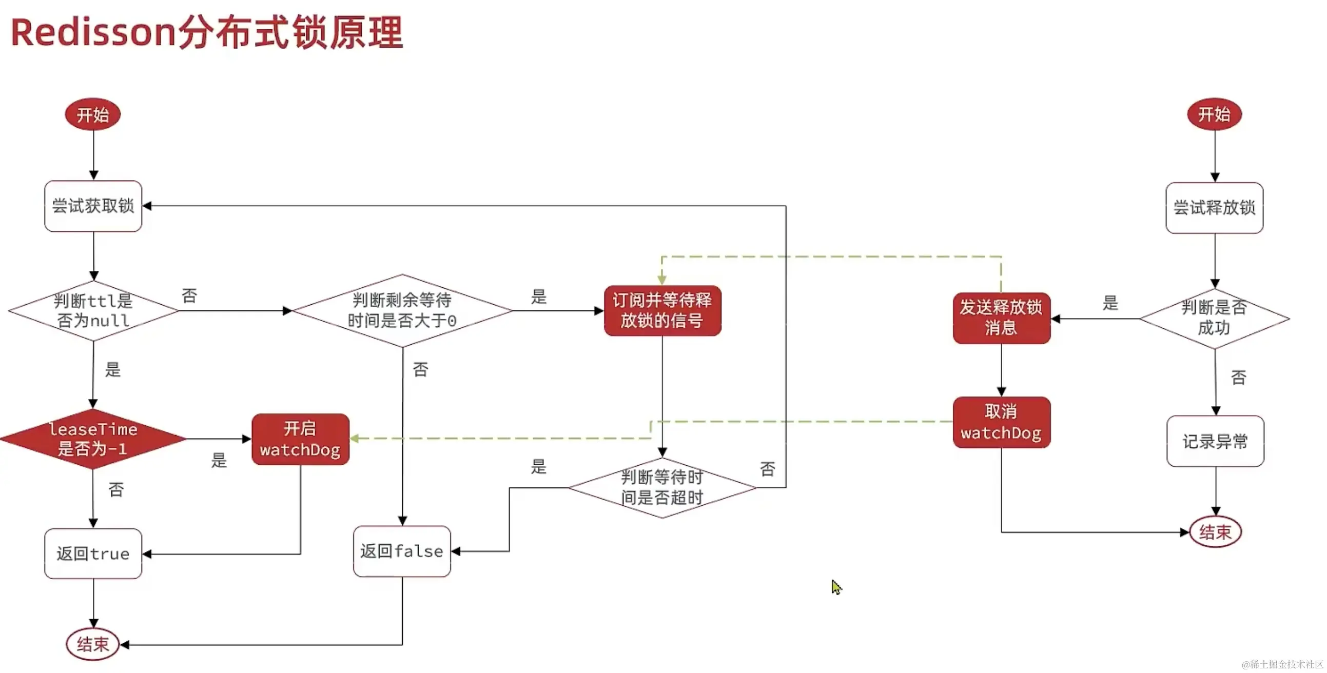 - 锁释放时间(leaseTime)必须大于抢锁最大等待时间(waitTIme),否则会出现第一个节抢到锁后,第二个节点还没抢到锁,就被释放了。如果制定了waitTIme和leaseTime,默认leaseTIme = waitTIme * 2
