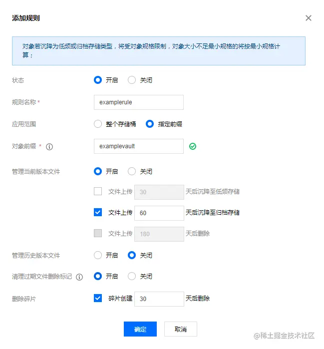 例如,设置数据在30天自动沉降为归档存储,或1年后自动删除数据,来降低存储成本。