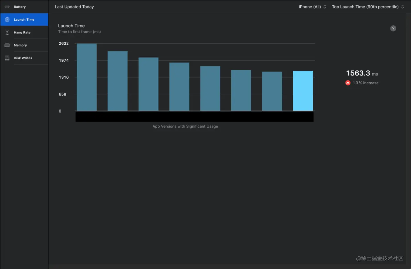 苹果会把过去24小时随app版本分布的启动总耗时展示出来,缺点在于数据展示不可定制。