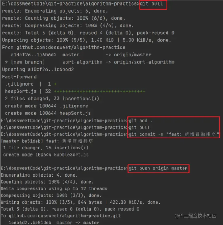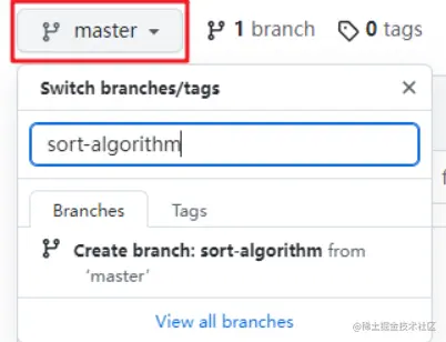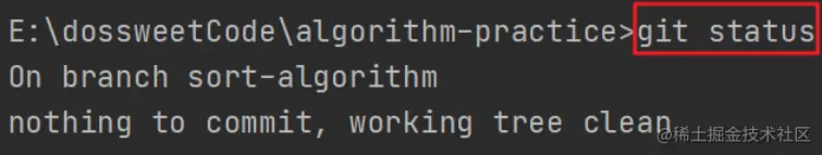 然后执行git branch就可以发现本地有两个分支了,而且当前处于sort-algorithm分支。