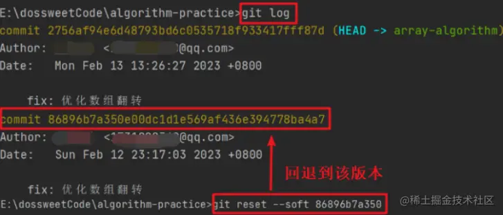 然后使用git log查看本地提交记录。发现刚提交的commit为最新版本。此时如果想回退到上次的commit版本时,可以使用 git reset --soft commit id 来进行回退: