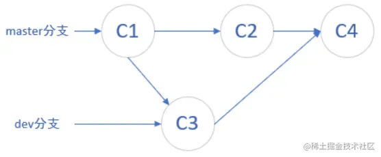 并且如果开发者B想直接merge代码到项目主分支的话,git会报错提示:当前主分支版本 (C1) 落后于远程主分支版本 (C2) ,此时我们需要先执行git pull命令,再在本地主分支上执行merge分支dev的操作,然后再推送到云端。