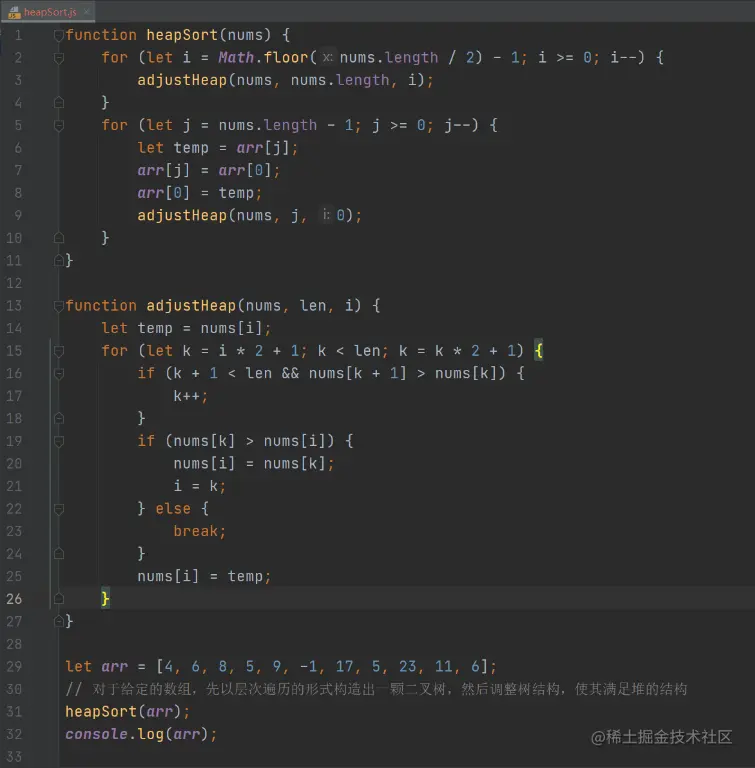 接下来,我们在项目根目录下新建一个堆排序的js文件,并填充算法内容: