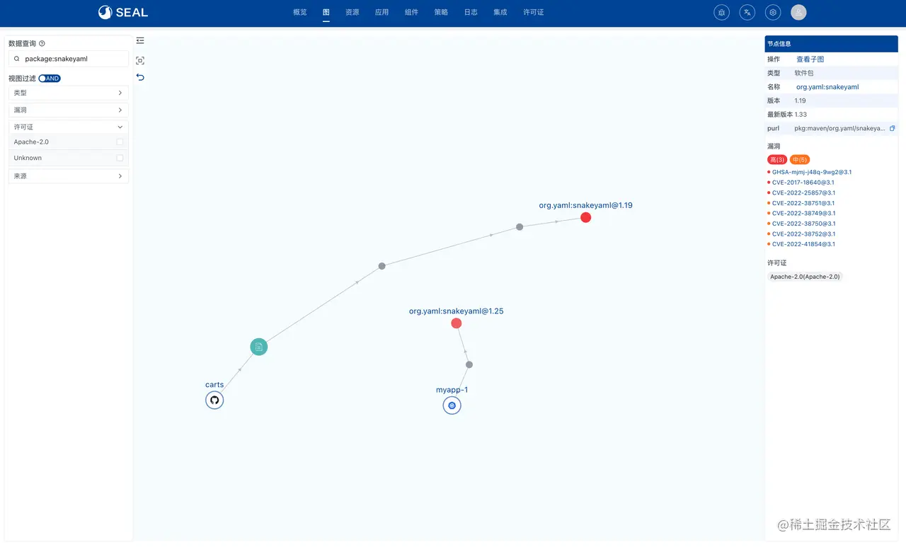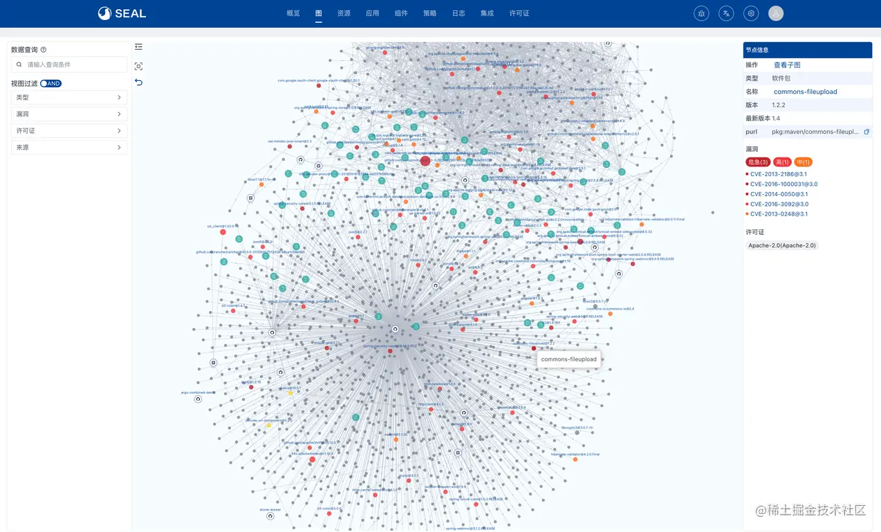 在 Seal 0.4 中新增了软件供应链知识图,直观地展示供应链中的组件类型以及它们的关联关系。此外,用户可以设置多种检索条件充分掌握软件资产安全合规情况。