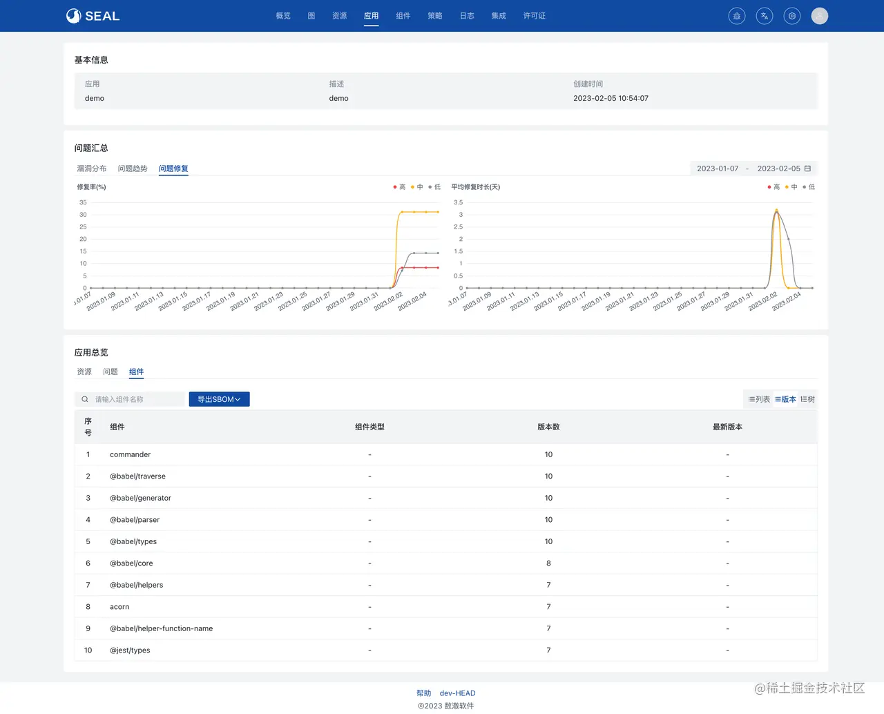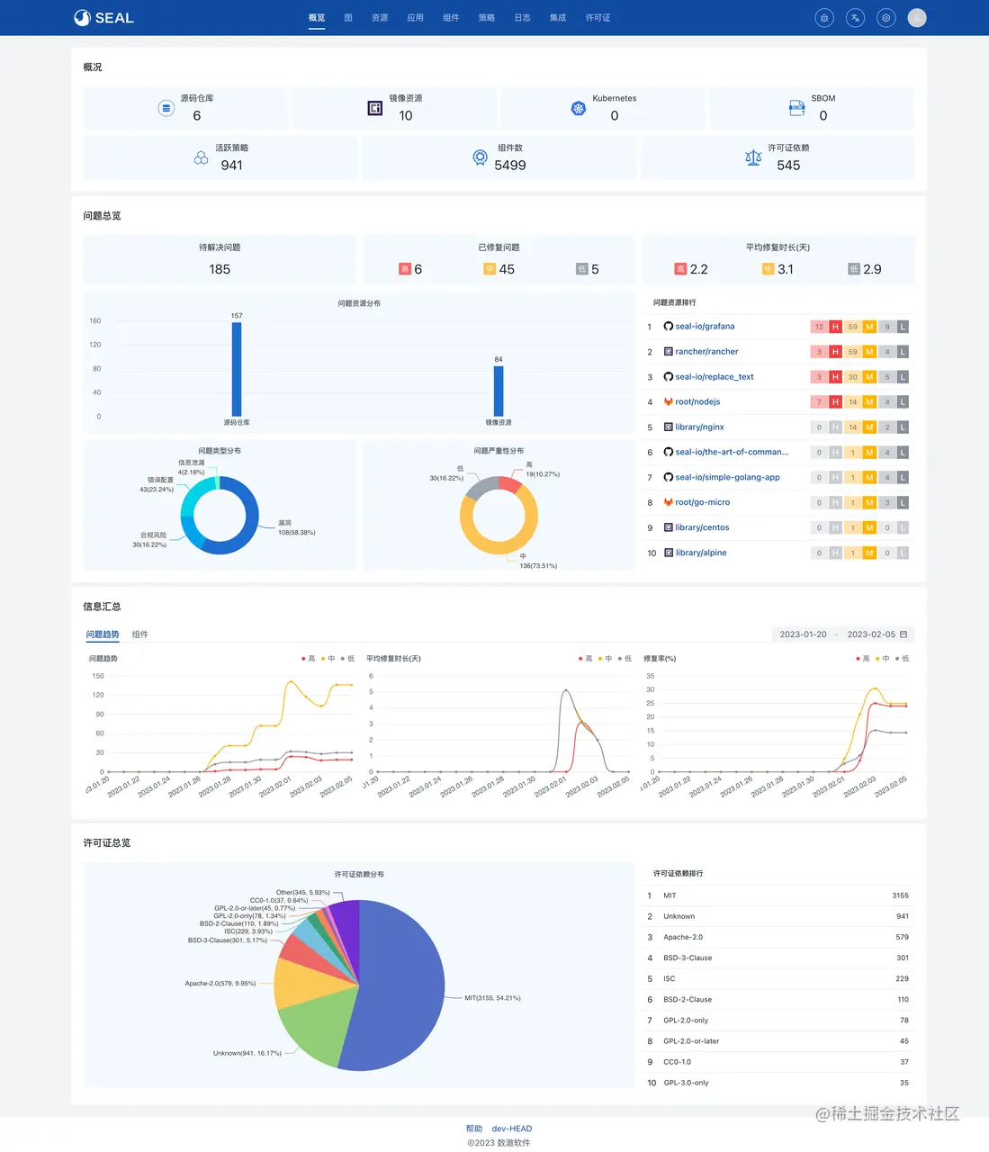 在 Seal 0.4 中,全局视图将全面升级,用户可以在概览中查看更丰富的统计信息和指标数据,比如问题严重性分布、许可证依赖分布、问题趋势等。