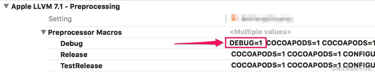 我们进入到Build Settings里面,可以找到Apple LLVM Preprocessing,这里我们可以找到Preprocessor Macros在这里,我们是可以加一些环境变量的宏定义来标识符。Preprocessor Macros可以根据不同的环境预先制定不同定义的宏。