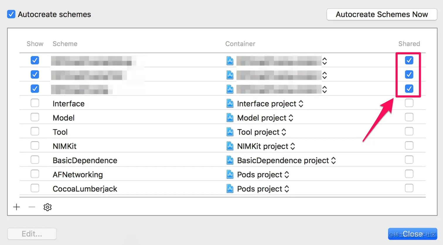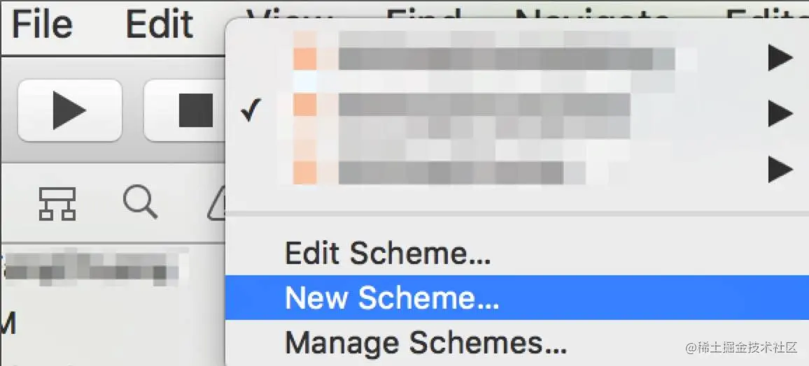 注意:如果是使用了Git这些协同工具的同学这里还需要把刚刚新建的Scheme共享出去,否则其他人看不到这个Scheme。选择“Manage Schemes”