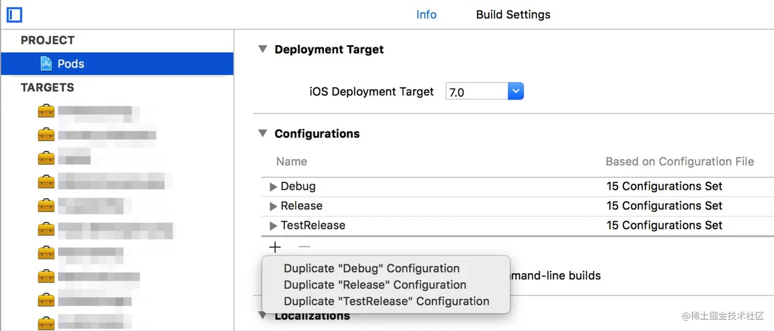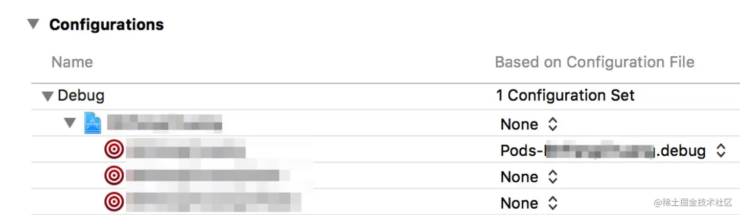 这里我们选择一个Duplicate “Debug” Configuration,因为我们新的环境需要debug,添加完了之后就会多了一套Configuration了,这一套其实是包含了一些编译参数的配置集合。如果此时项目里面有cocopods的话,打开Configuration Set就会发现是如下的样子: