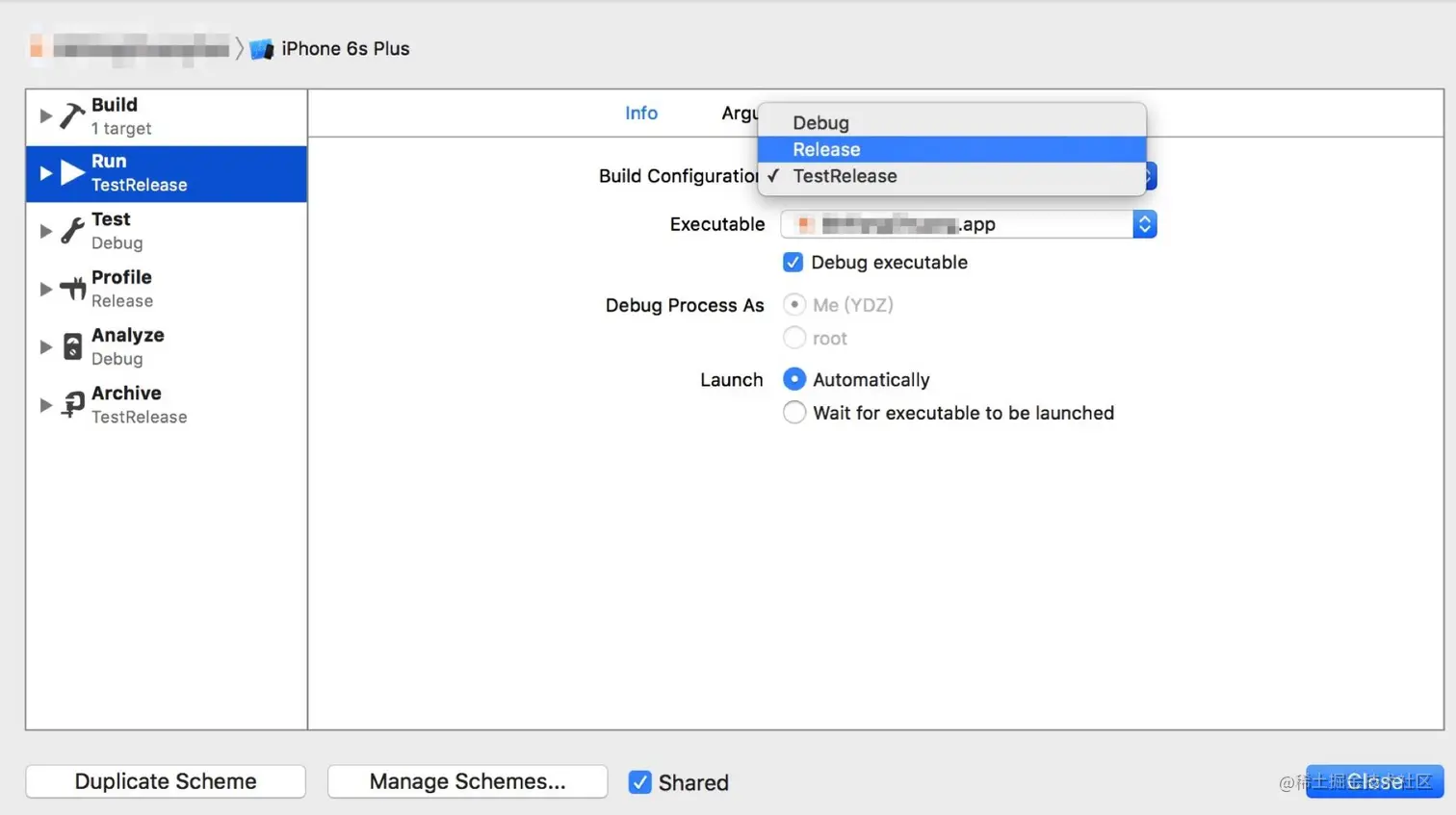 注意这里一定要把Scheme的名字和编译方式区分开,选择了一个Scheme,只是相当于选择了一个环境,并不是代表这Debug还是Release。