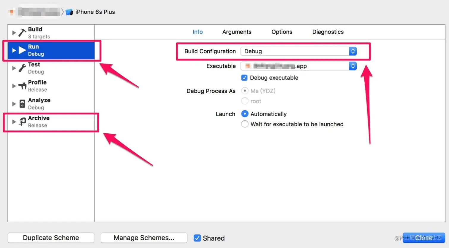 新建完成之后,我们就可以编辑刚刚新建的Scheme,这里可以把Run模式和Archive都改成新建Scheme。如下图: