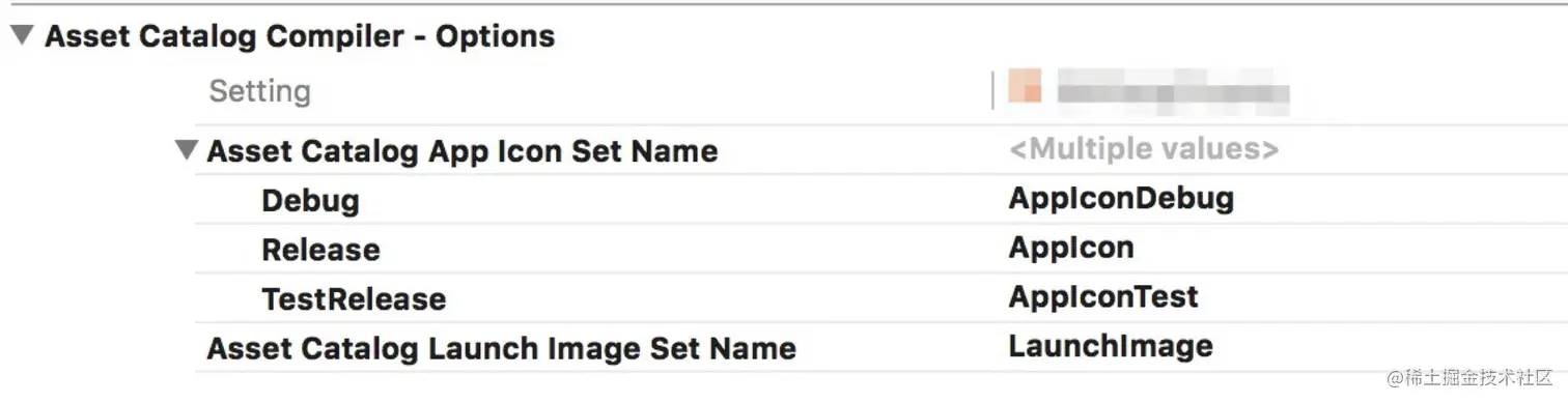 新建完AppIcon之后,再在Build Setting里面找到Asset Catalog Compiler里面,然后把这几种模式下的App Icon set Name分别设置上对应的图标。如上图。