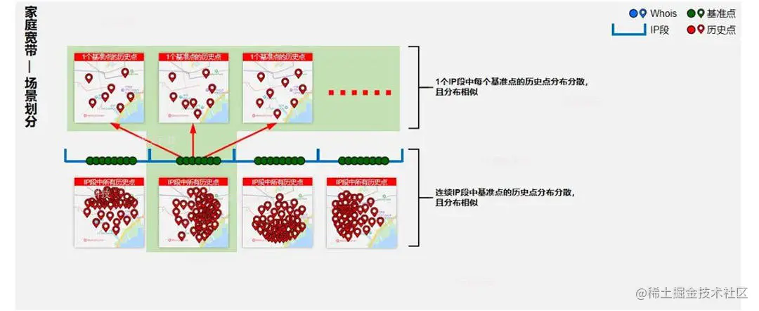 例如,对企业专线场景IP,收集挖掘一定时间内的IP位置信息;对家庭宽带场景IP,挖掘出多种数据来源提供的IP位置信息。针对不同场景IP基准点的分布特性和网络探测响应情况等,对基准点进行相应的动态聚类分析,排除异常基准点,通过IP定位算法得到最优定位结果。