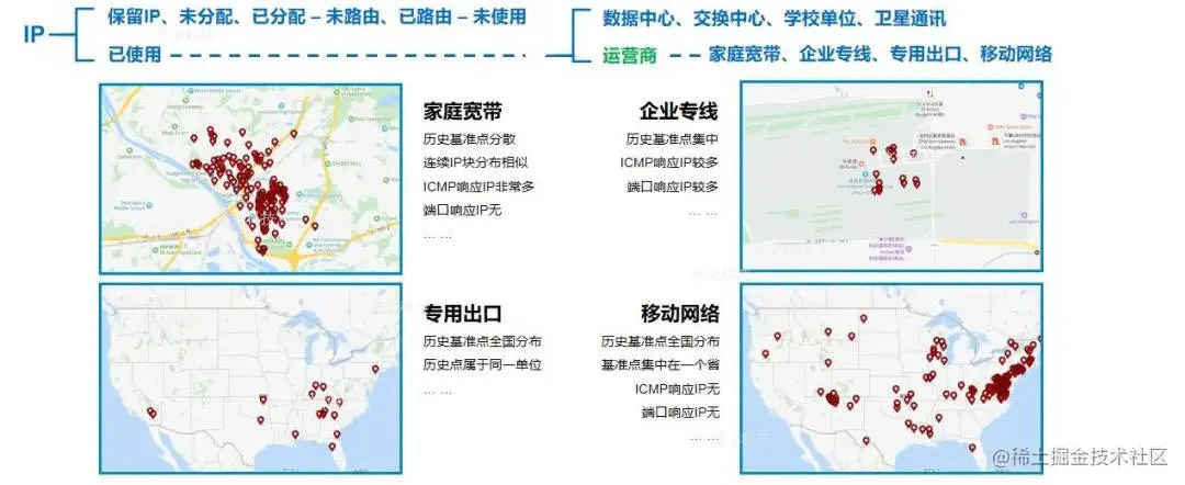 这里面包含的技术路径是:1.对WHOIS信息、BGP信息、IP指纹信息、地理覆盖范围、网络拓扑、对应域名、端口等数据,结合IP的物理特征和网络特征进行深度挖掘,利用机器学习分类算法完成IP应用场景的精细划分。