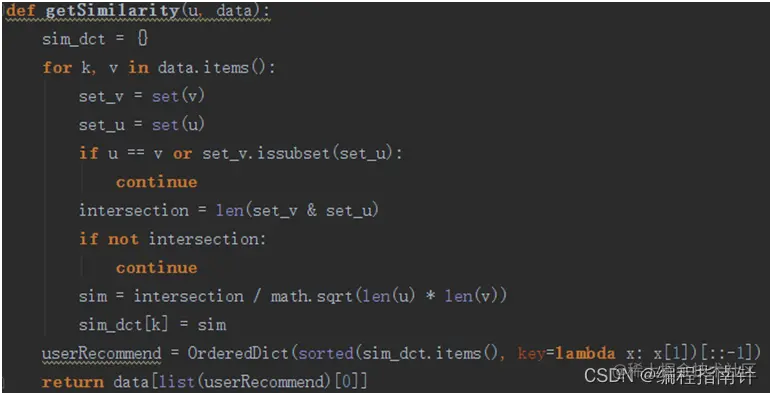 该系统设计了收藏景点功能,其作用一方面是方便用户再次查看自己感兴趣的景点,另一方面也为用户推荐景点功能做基础。该系统的推荐功能是利用基于用户行为的协同过滤算法进行实现的,用户每次的收藏行为都会记录在数据库中,当目标用户进行自己的收藏行为时,系统就会利用相应的计算方法,在所有用户中寻找到与他最为相似的一类用户,提取这些用户收藏的全部景点,并且对目标用户收藏的景点进行剔除,计算用户对每一个候选景点的感兴趣程度,最终为用户推荐几个最为感兴趣的旅游景点。下图5.3是基于用户行为的协同过滤算法部分代码截图。