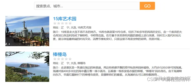 此功能的目的是用于筛选旅游景点,使用者可通过图6.4所展示的搜索框,搜索自己想要了解的旅游景点或城市。例如搜索城市大连,系统就会为用户展示大连这所城市所有的旅游景点,具体效果如图6.5所示。