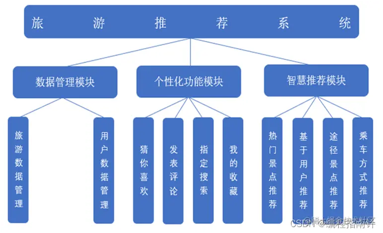 该系统前端功能设计丰富,可以将划分为三大功能模块,即登陆注册模块、个性化功能模块、推荐功能模块。