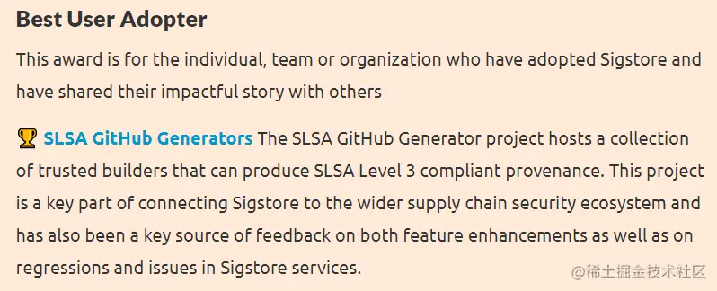值得一提的是,SLSA GitHub generator获得sigstore社区2022年度徽章Best User Adopter。