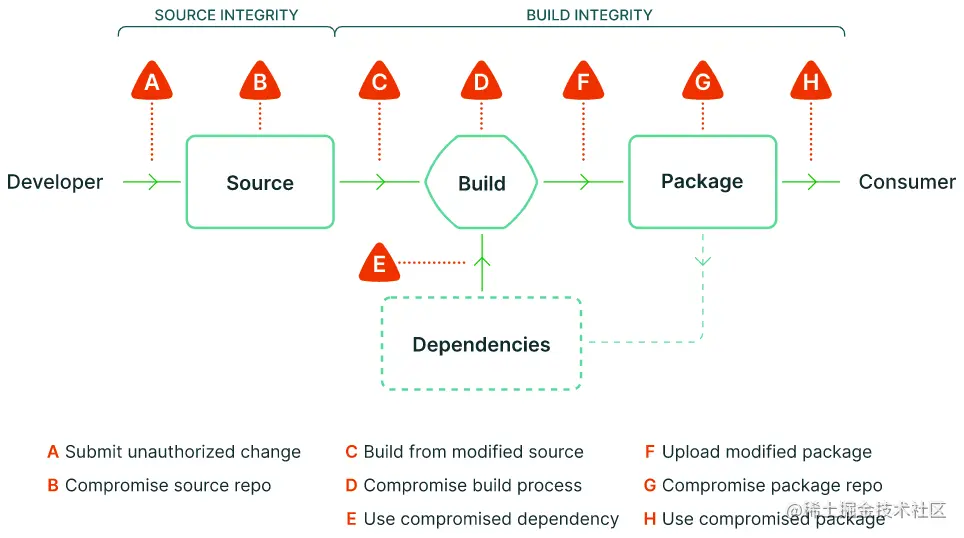 下图描述了软件供应链中已知的攻击点。更多详细描述,可参考slsa.dev/ 。