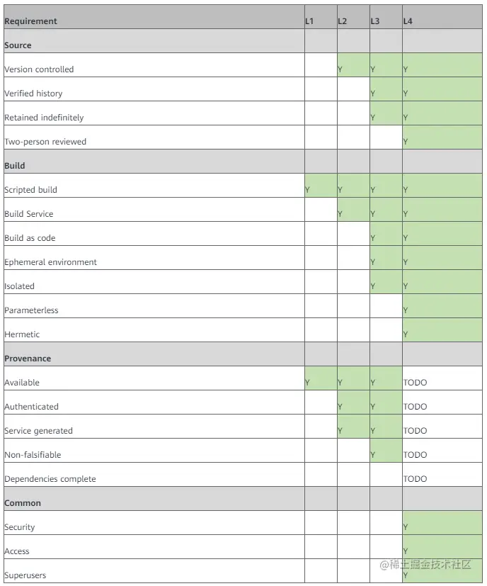 截止目前,SLSA评估等级共分为4个等级L1~L4,安全性由低到高,每个等级有不同的达标要求,详细的达标要求可参考SLSA详细标准(slsa.dev/spec/v0.1/r… )。
