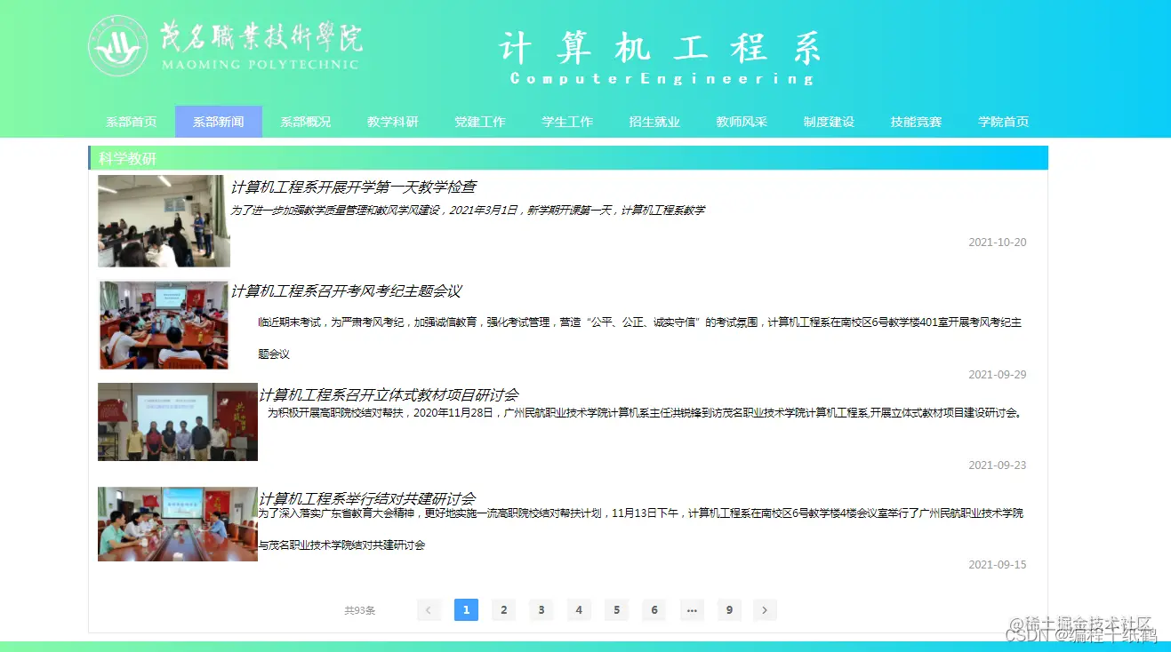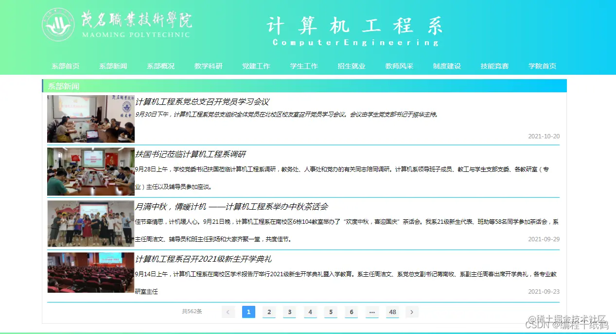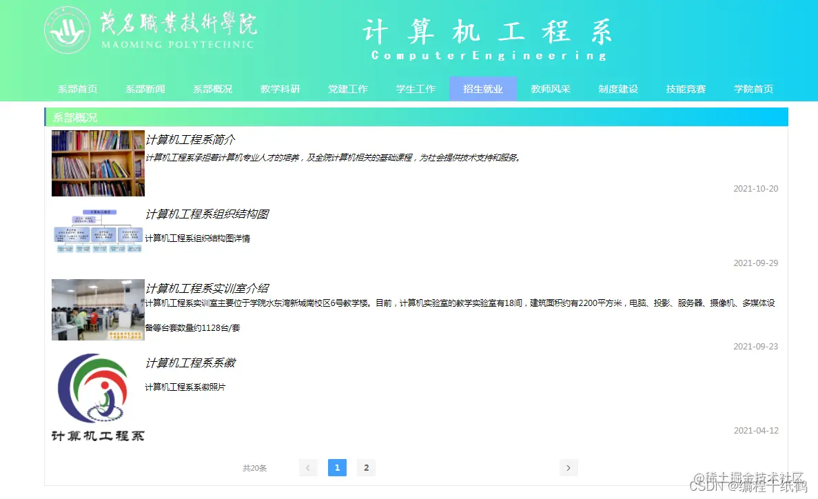 本项目基于纯前端技术为学院开发实现了一个学院网站系统,界面美观大方,采用Nodejs+Vue+ElemenetUI开发实现,主要包含:首页展示、系部新闻、系部概况、教学科研、党建工作、学生工作、招生就业、教师风采、制度建设、技能竞赛、学院首页等功能模块。