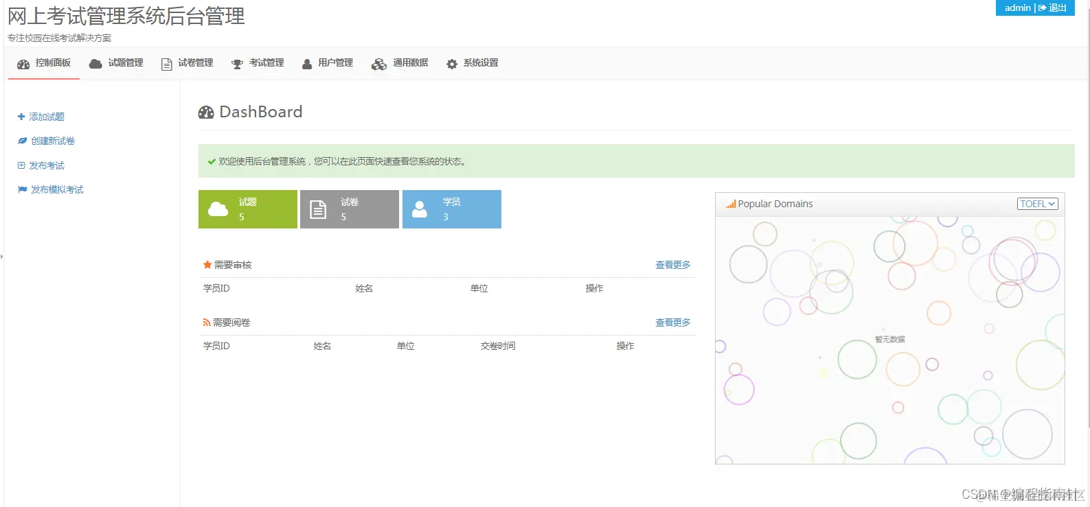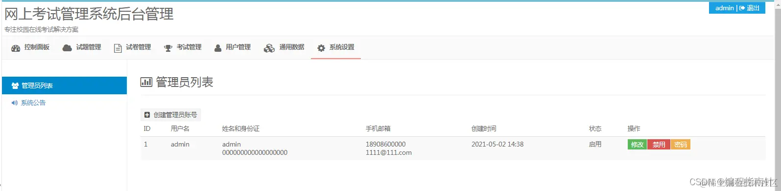 用户模块只要是让普通用户使用,包括题库及试卷管理,成绩查询等功能,管理员模块只要是让管理员使用,包括学生信息管理、教师信息管理、试卷管理等功能,可以对数据进行添加、删除、修改及查询等操作。