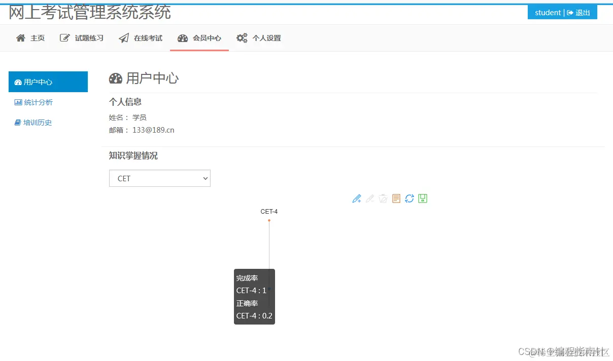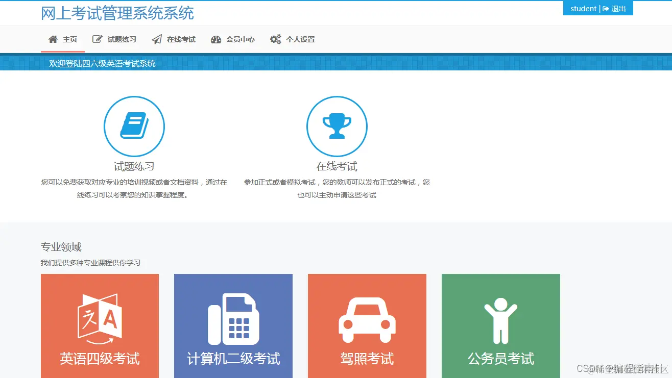 本项目主要实现SSM开发框架实现在线考试管理系统,采用前后端分离的方式开发实现,基于接口实现前后端开发对接,后端服务系统主要实现的管理功能有:试题管理、试卷管理、考试管理、用户管理、数据字典管理、系统设置管理。前端用户服务实现的功能有:试题练习、在线考试、会员中心、统计知识掌握情况、统计分析各种考试数据等功能。整体功能比较强大,也比较完整。