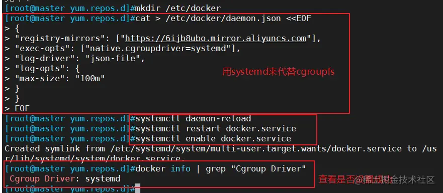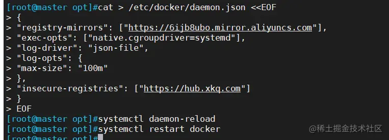 cat > /etc/docker/daemon.json <<EOF### 下面命令也需要在master和node节点重新执行,因为之前没有指定harbor仓库地址
