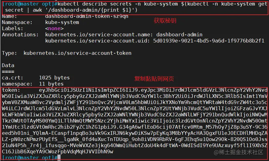kubectl describe secrets -n kube-system $(kubectl -n kube-system get secret | awk '/dashboard-admin/{print $1}')