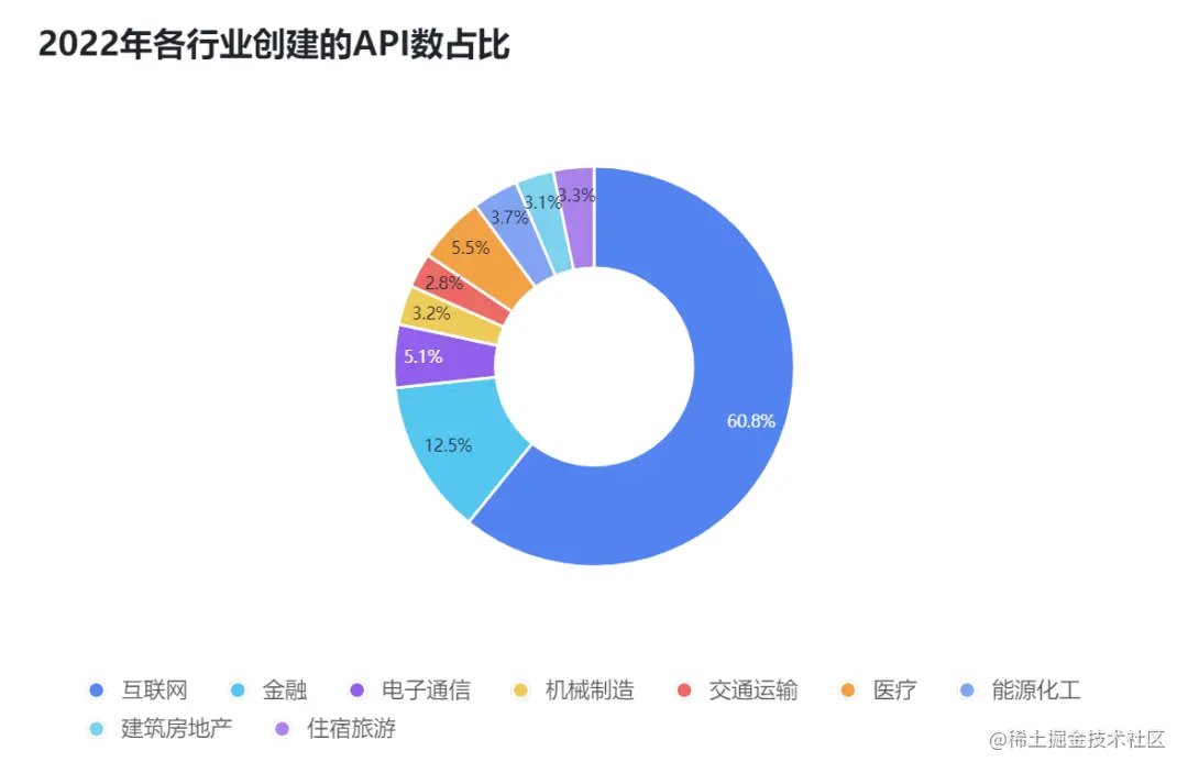 在被创建的API中,互联网行业所创建的API数量占比达到60.8%,比其他行业的总和还要多;其次为金融行业,占比达到12.5%。