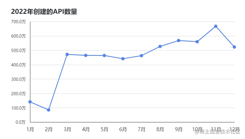 在2022年,我国一共有6700多万个API被创建,相比2021年增长了16%。从2022年API创建数量趋势可以看出,从3月开始,API数量迎来爆发增长,之后持续处于高位,11月单月创建的API数量突破600万个,达到峰值。