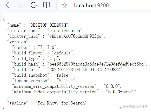 进入bin文件, 双击执行 elasticsearch.bat,然后打开浏览器,进入页面: http://localhost:9200,看到以下输出,表示启动成功。