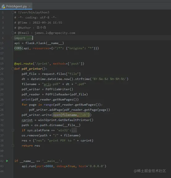 具体 PDF.exportDocument 可以参考文档: demo.grapecity.com.cn/activerepor… 后端实现方式: 我这边是采用 python 实现了一个接口,接收前端传递的 Blob 文件流,然后调用后端部署的服务器默认打印机直接进行静默打印。