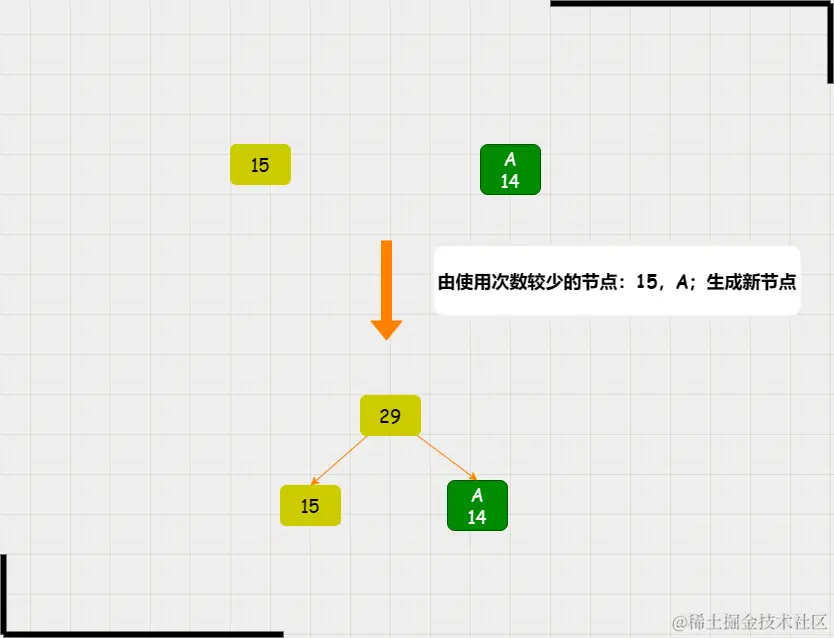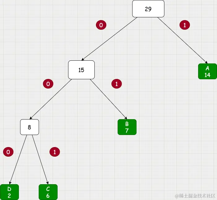 - 第三次参与构建新节点的的节点: 15,A(14);直接用这2个节点生成root节点;Huffman树构建结束。