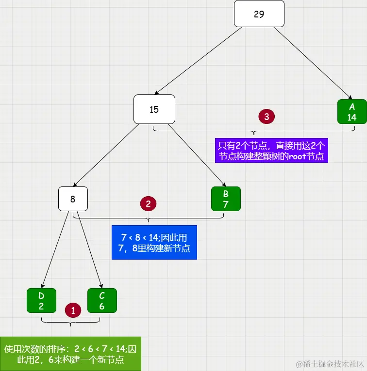 - 每次都用2个最少使用频率节点来构建新节点;