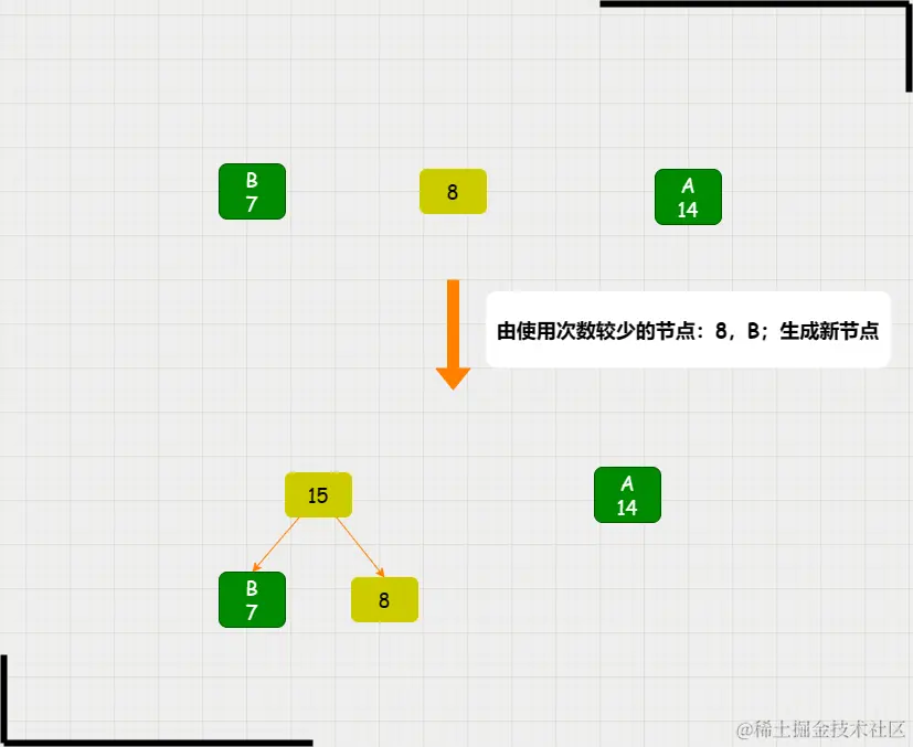 参与第二次构建Huffman树的新节点:8,B(7),A(14),这3个节点再比较使用次数: 7 < 8 < 14 ;因此使用 B(7),8节点来构建新节点:15;