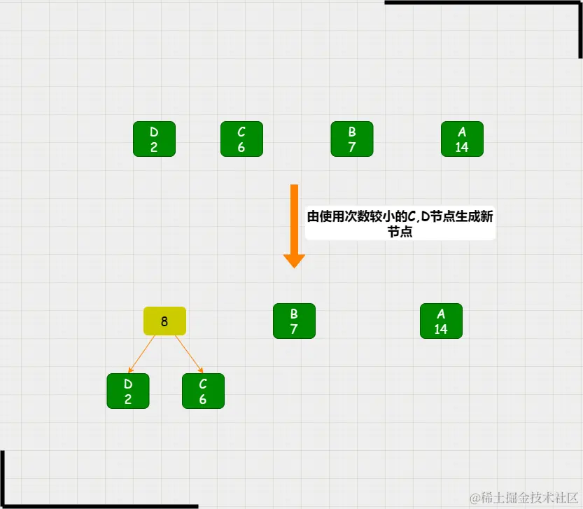 最开始有 A,B,C,D四个节点,经过排序之后由较小的2个节点生成新的节点。因此选择C,D来生成新节点:8;生成新节点之后C,D节点不再参与后续的过程。