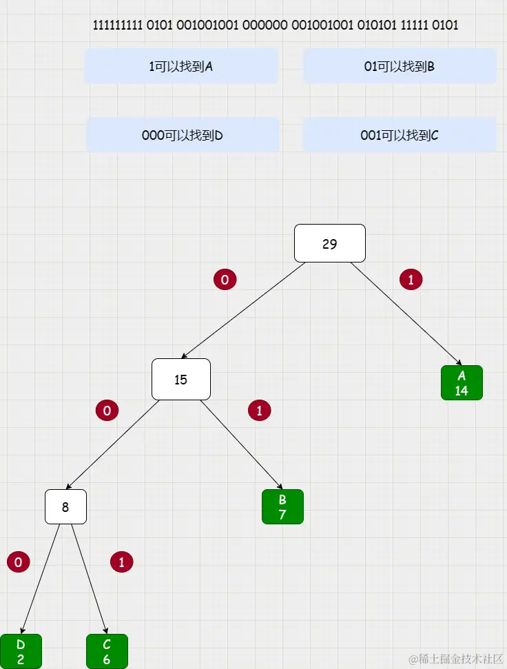 可以看出来,使用频率最高的A,从根节点到A的路径是最短的,而使用频率最小的D,从根节点到D的距离是最长的。这路劲长短正好对应了使用频率的高低。如果一个节点链接left节点用 0 表示;链接 right 节点用 1表示;(反过来也可以)那么从root节点到叶子节点的路径就可以用01字符串来表示了;