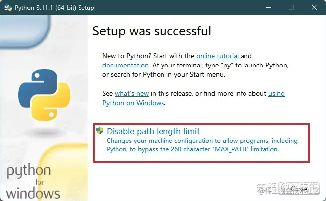 4、然后如果弹出下面这个框,点击“Disable path length limit”的按钮,然后点击close关闭。“Disable path length limit”是指,禁用系统的Path长度自动限制,能给我们避免很多的麻烦。禁用路径长度限制更改计算机配置,以允许包括Python在内的程序绕过260个字符的“最大路径”限制。这是说明你电脑对Python的一些限制,点击它然后确定权限就可以了