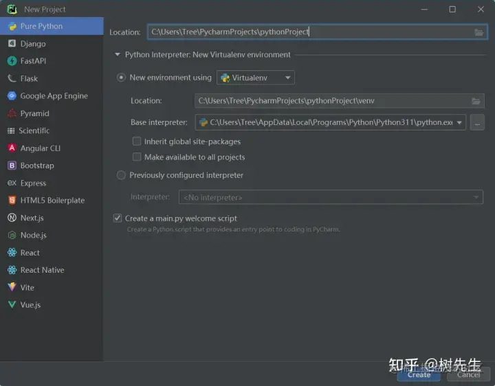 2、弹出创建各种类型的Python工程,这里我们创建一个Python命令行应用,选择“Pure Python”,如下图所示,Location选择Python工程路径,Base interpreter选择我们前面安装的最新版Python解释器,点击“Create”按钮