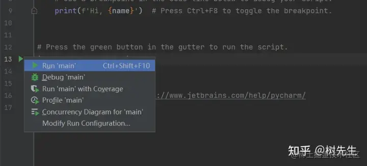 4、在main.py文件中的绿色三角箭头点击右键,选择“Run main”(快捷键Ctrl + Shift + F10),开始执行