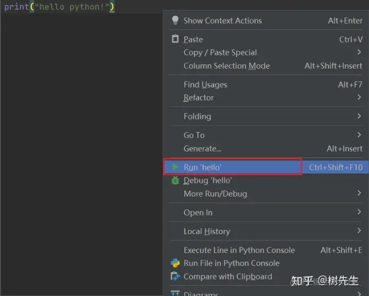 8、在hello.py中输入如下python语句,右键“Run hello”