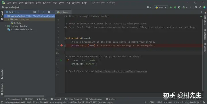 3、创建的Python工程如下图所示,左侧为工程树文件,右侧为具体的文件内容,这里自动创建了一个main.py