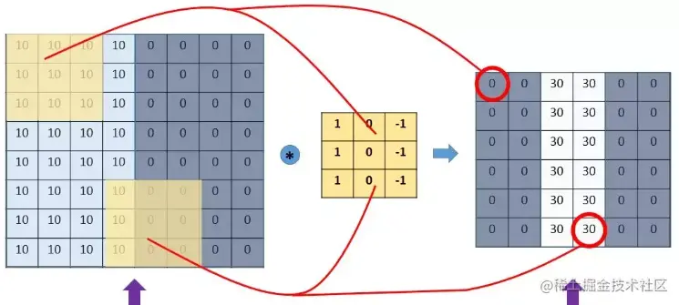 图片中的数字代表该位置的像素值像素值越大,颜色越亮,所以为了示意,把右边小像素的地方画成深色。图的中间两个颜色的分界线就是要检测的边界。可以设计这样的一个 滤波器(filter,也称为kernel),这样的一个**kernel**就是卷积核。