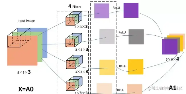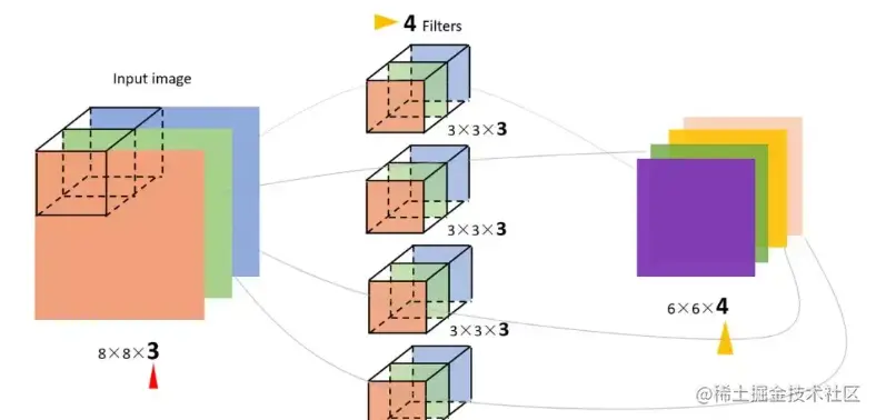 如果输入图片是三维的,如是(8,8,3),这个时候filter的维度就要变成(3,3,3)了,它的最后一维要跟输入的channel维度一致。这个时候的卷积,是三个channel的所有元素对应相乘后求和,也就是之前是9个乘积的和,现在是27个乘积的和。因此,输出的维度并不会变化。还是(6,6)。但是一般情况下,会使用多个filters同时卷积,如果同时使用4个filter的话,那么输出的维度则会变为(6,6,4) :