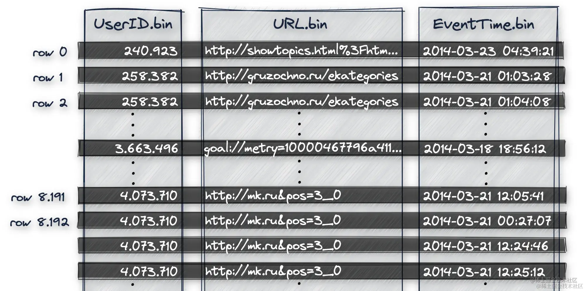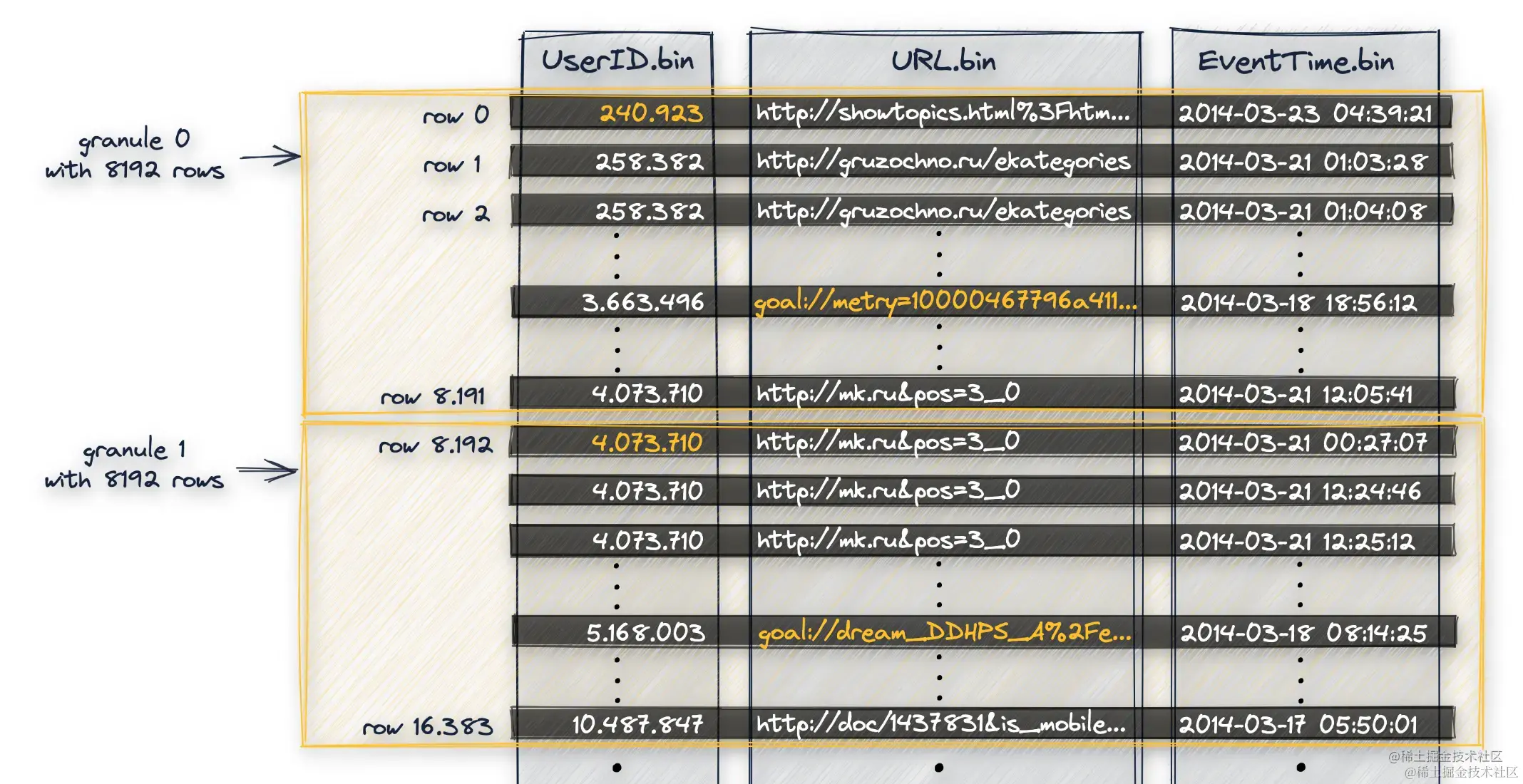 - 数据按照主键顺序一次排序 UserID首先做排序,然后是URL,最后是EventTime