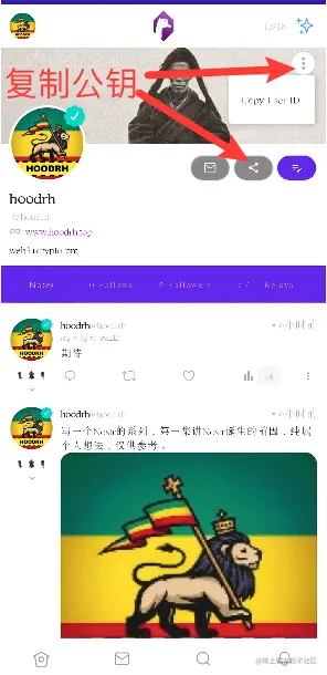 在个人首页,你可以看到你发布在Nostr网络上的内容、你关注的人、关注你的人、你连接的中继器(Relay)、私信、分享账号、个人信息设置等功能。其中,点击“分享”或“…”之后都可以复制自己的公钥,其他人可以通过公钥来找到你。